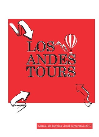 Este manual presenta las directrices para la aplicación correcta de la identidad visual corporativa de Los Andes Tours, incluyendo el logotipo, guía de colores, aplicaciones permitidas y áreas de protección. El logotipo consiste en el nombre de la empresa en letras mayúsculas y un isotipo de una montaña y globo, y no debe ser alterado. Se proporcionan ejemplos de aplicaciones correctas en diferentes fondos, así como las reducciones permitidas.