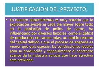 Este documento presenta un proyecto de investigación para la producción de 1000 pollos para carne en el distrito de Santo Domingo. El proyecto justifica la crianza de pollos por su alto consumo y demanda. Se detallan los objetivos, materiales, equipos, instalaciones y métodos para la cría de los pollos incluyendo la alimentación, vacunación, selección, densidad poblacional y enfermedades más comunes. El proyecto tendrá una duración de 6 semanas en la parcela El Lanche en Santo Domingo.