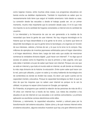 La entrevista trata sobre Manuel Castells, un sociólogo y profesor universitario español reconocido por sus investigaciones sobre la sociedad de la información y la relación entre internet y la sociedad. Castells discute temas como la importancia del acceso a internet, el uso de la tecnología en la educación, y los efectos de internet y los dispositivos móviles en procesos mentales como la atención y la memoria en los niños.