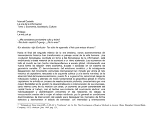 El documento resume los principales cambios sociales, económicos, políticos y tecnológicos ocurridos a finales del siglo XX, incluyendo la revolución de la información, la globalización de los mercados, el colapso de la Unión Soviética, la reestructuración del capitalismo y el surgimiento de las redes digitales. También describe los cambios sociales como la transformación de las relaciones de género, el aumento del fundamentalismo religioso y la búsqueda de identidad colectiva e individual. Finalmente, plantea que