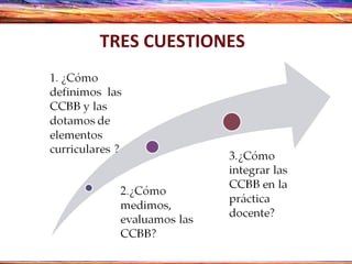 El documento describe la estructura normativa para la evaluación de las competencias básicas en España, incluyendo decretos reales, áreas curriculares, objetivos, contenidos y criterios de evaluación. Explica cómo relacionar estos elementos curriculares con las competencias clave a través de indicadores, y cómo esto permite definir operativamente las competencias. Finalmente, sugiere que este enfoque puede usarse para tomar decisiones sobre el proyecto educativo de un centro y constituirlo como una comunidad basada en la transparencia y profesionalidad doc