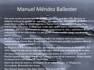 Manuel Méndez Ballester fue un escritor puertorriqueño nacido en 1909 que escribió obras de teatro y novelas históricas sobre Puerto Rico. Trabajó en varios empleos incluyendo en una central azucarera donde conoció la vida de los trabajadores, lo que lo inspiró para escribir. Su primera obra de teatro fue El Clamor de los Surcos que ganó un premio en el Ateneo Puertorriqueño. Escribió varias obras más antes de fallecer en Puerto Rico en 2002.