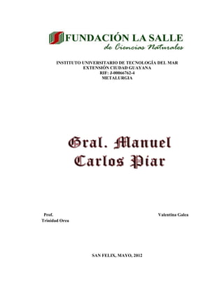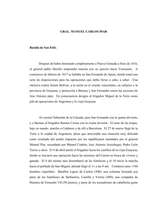 Este documento resume la Batalla de San Félix del 11 de abril de 1817 entre las fuerzas republicanas lideradas por el general Manuel Piar y las realistas comandadas por el brigadier Miguel de la Torre. Piar esperó a la Torre en una sabana cerca de San Félix con 2200 hombres. La Torre atacó con 1180 hombres pero fue rechazado por los republicanos, que mataron a una tercera parte de sus tropas. La Torre se retiró con solo 105 hombres, mientras que los republicanos tuvieron 31 muertos y 65