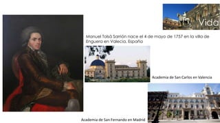 Manuel Tolsá fue un arquitecto español que llegó a México en 1791 para dirigir el área de escultura en la Academia de San Carlos. Diseñó numerosas obras neoclásicas importantes como la Catedral Metropolitana de la Ciudad de México, el Palacio de Minería y el Hospicio Cabañas de Guadalajara. El Palacio de Minería es considerada su obra maestra y la obra más importante del estilo neoclásico en Latinoamérica.