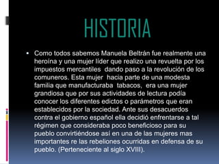 Manuela Beltrán fue una heroína y líder del siglo XVIII en Colombia que lideró una revuelta contra los impuestos mercantiles impuestos por el gobierno español, dando inicio a la revolución de los comuneros. Como una mujer educada que se oponía al régimen español, decidió enfrentarse a él para defender a su pueblo de políticas que consideraba perjudiciales. A pesar de su bondad y deseos de justicia, fue una mujer de acción cuya revolución logró mayor igualdad y precios más accesibles para su p