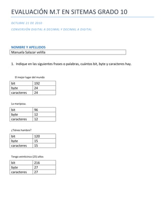 Este documento presenta una evaluación sobre la conversión entre sistemas binarios y decimales. Contiene cuatro preguntas. La primera pregunta pide calcular la cantidad de bits, bytes y caracteres para diferentes frases. La segunda pregunta pide convertir números binarios a decimales. La tercera pregunta es lo opuesto, convertir números decimales a binarios. Finalmente, se provee la nota obtenida, que fue 2.7.