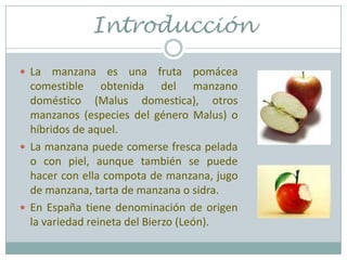El documento proporciona información sobre la manzana, incluyendo su historia, usos y variedades. La manzana ha sido una importante fuente de alimento durante miles de años y se cultiva en climas fríos de todo el mundo. Existen más de 7,500 variedades de manzanas que se distribuyen en zonas templadas y subtropicales. Algunas variedades populares incluyen Braeburn, Fuji, Gala y Granny Smith.