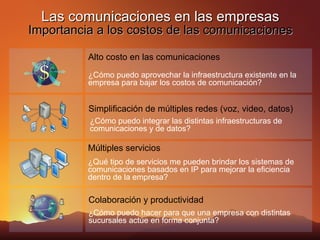 El documento describe los beneficios de implementar un sistema de telefonía IP en una empresa, incluyendo la reducción de costos de comunicaciones, la colaboración mejorada entre sucursales, y la integración de voz, video y datos en una sola red. Explica los componentes clave como el servidor, tarjetas, teléfonos IP y software como Asterisk, así como funciones como conferencias de video y IVR. Resalta que la inversión es baja comparada con sistemas tradicionales y ofrece rápido retorno debido a los ahorros en llamadas