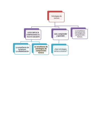 El documento presenta información sobre estrategias de lectura y alfabetización inicial. Explica que la lectura implica comprender el texto escrito y que la enseñanza de estrategias de comprensión lectora es importante. También discute el uso de estrategias como el conocimiento previo, la evaluación de la consistencia del contenido y la revisión auto guiada para mejorar la comprensión.