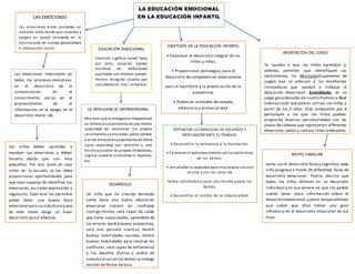 El documento describe cómo los juegos como Emotiblocks ayudan a los niños a aprender y a identificar sus emociones. Una buena educación emocional les permite a los niños crecer con confianza, autoestima y habilidades para manejar conflictos y desafíos. La educación emocional en la infancia es importante porque las emociones juegan un papel clave en el desarrollo de la personalidad y las interacciones sociales.