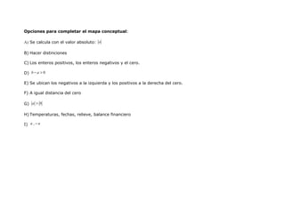 El mapa conceptual presenta la estructura de los números enteros, incluyendo los positivos, los negativos y el cero, y cómo se ubican en la recta real. Los opuestos como a e -a están a igual distancia del cero y la distancia de un número entero al cero se calcula con el valor absoluto.