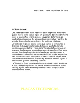 Este documento presenta una breve introducción sobre las placas tectónicas. Explica que la litosfera terrestre está dividida en grandes placas y microplacas que se mueven sobre la astenosfera. En los bordes de las placas hay actividad sísmica, volcánica y tectónica que da lugar a cadenas montañosas y cuencas. También menciona que la Tierra es el único planeta en el sistema solar con placas tectónicas activas actualmente.