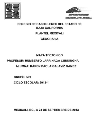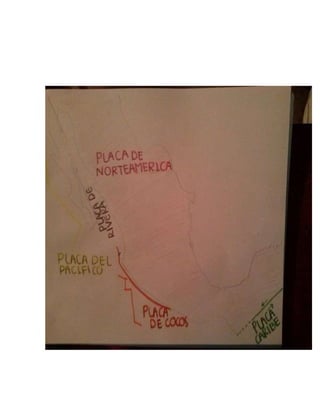Este documento presenta información sobre las placas tectónicas en México. Explica que las placas tectónicas forman la superficie de la Tierra y que se desplazan sobre el manto terrestre, lo que causa sismos. El objetivo es ubicar las placas tectónicas en México para identificar las áreas con mayor probabilidad de sismos, como Mexicali, Guadalajara y los estados del Pacífico, donde pasan las placas Norteamericana y de Cocos.