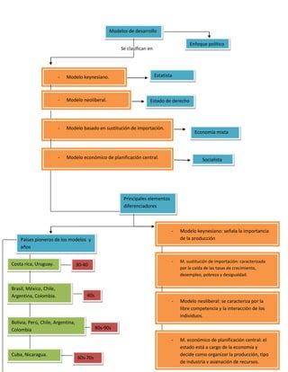 El documento describe cuatro modelos de desarrollo económico: el modelo keynesiano, el modelo basado en sustitución de importación, el modelo neoliberal y el modelo económico de planificación central. Cada modelo se caracteriza por su enfoque político y económico, los países pioneros y los años en que se implementaron, y sus respectivas políticas sociales.