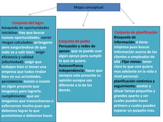 Este documento presenta tres conjuntos de habilidades para lograr objetivos: el conjunto del logro (buscar nuevas oportunidades, tomar riesgos calculados, exigir eficiencia y calidad, persistencia y cumplimiento), el conjunto de poder (usar redes de apoyo y autoconfianza e independencia), y el conjunto de planificación (buscar información, fijar metas, y planificar y seguir tareas de manera sistemática).