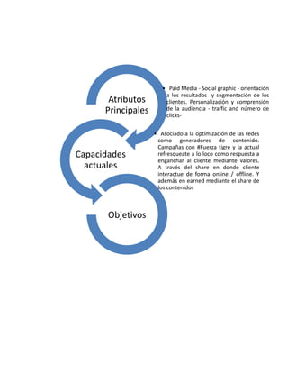Este documento describe las capacidades y objetivos de una campaña de marketing digital. Se enfoca en el uso de paid media como anuncios sociales personalizados para atraer clientes y aumentar el tráfico y clics. Actualmente genera contenido en redes sociales usando hashtags para conectar con los valores de los clientes y aumentar el compromiso en línea y fuera de línea. Los objetivos generales de la campaña no se especifican.