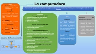 Este documento describe las partes principales de una computadora, incluyendo el hardware y el software. Explica las cinco generaciones de computadoras desde 1951 hasta la actualidad, destacando los cambios en los componentes, lenguajes y capacidades con cada generación. También resalta la importancia del procesamiento de datos para tareas como planificar el reclutamiento de personal. Finalmente, distingue entre computadoras analógicas y digitales.