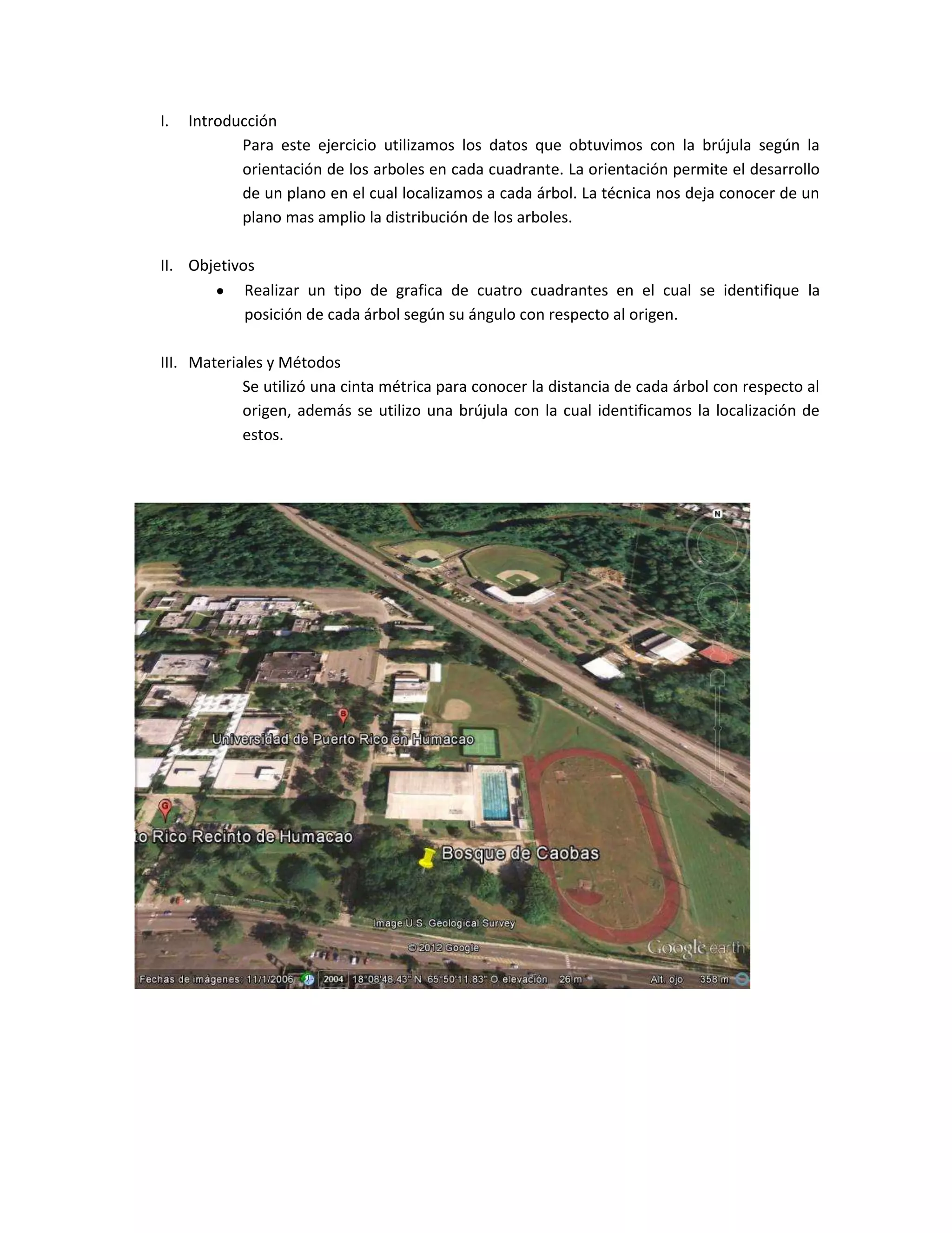 El documento describe un ejercicio para mapear la ubicación y orientación de árboles en un bosque dividiéndolo en cuatro cuadrantes usando una brújula y cinta métrica. El objetivo era crear un gráfico que identifique la posición de cada árbol en relación al origen. El mapa resultante proporcionó una visualización amplia de la distribución desigual de los árboles en el bosque.
