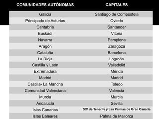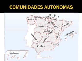 España está dividida en 17 comunidades autónomas y 2 ciudades autónomas. La lista incluye Cantabria, Euskadi, Navarra, Asturias, Galicia, La Rioja, Cataluña, Castilla y León, Aragón, Madrid, Islas Baleares, Valencia, Castilla-La Mancha, Extremadura, Murcia, Andalucía e Islas Canarias.