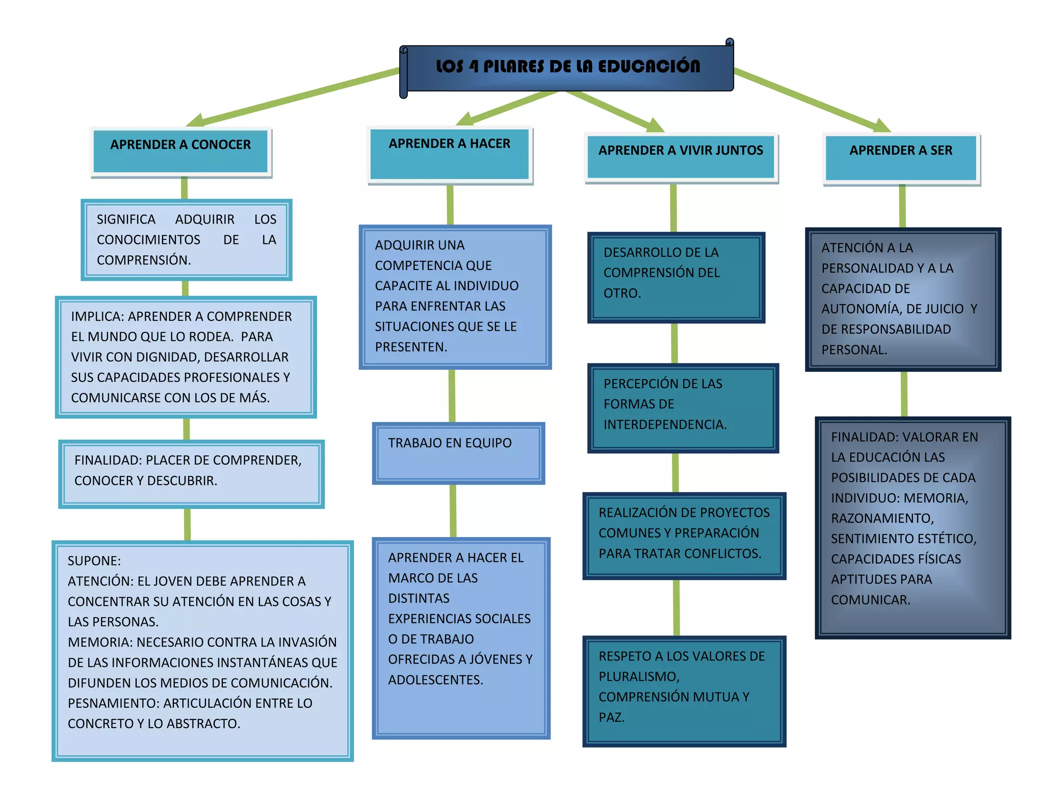 El documento describe los 4 pilares de la educación: aprender a conocer, aprender a hacer, aprender a vivir juntos, y aprender a ser. Aprender a conocer implica adquirir conocimientos y comprender el mundo. Aprender a hacer involucra desarrollar capacidades profesionales y comunicarse con los demás. Aprender a vivir juntos significa comprender a otros y percepción de interdependencia. Aprender a ser se refiere a desarrollar la personalidad y autonomía del individuo.