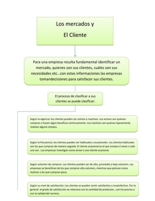 El documento describe cómo las empresas clasifican a sus clientes según su vigencia (activos o inactivos), frecuencia de compras (habituales u ocasionales), volumen de compras (alto, promedio o bajo) y nivel de satisfacción (satisfechos o insatisfechos) para tomar mejores decisiones que satisfagan las necesidades de los clientes.
