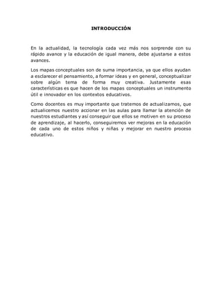 Los mapas conceptuales son herramientas innovadoras y efectivas para mejorar la comprensión de los estudiantes en contextos educativos, facilitando la conceptualización creativa de temas. Es responsabilidad de los docentes actualizar sus métodos y utilizar estas herramientas para motivar a los alumnos y optimizar su proceso de aprendizaje. La implementación de tecnologías de la información y la comunicación (TIC) en la educación es fundamental para mantenerla actualizada y efectiva.