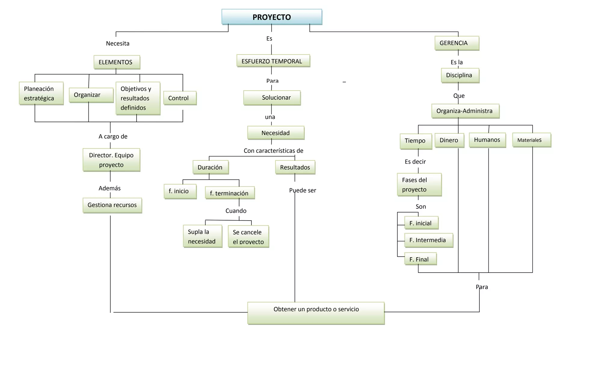 El documento describe los elementos clave de un proyecto, incluyendo la planeación estratégica, la organización de un director y equipo de proyecto, y la gestión de recursos humanos, materiales y financieros a lo largo de las distintas fases del proyecto, desde la fase inicial hasta la fase final, con el objetivo de suplir una necesidad y obtener un producto o servicio.