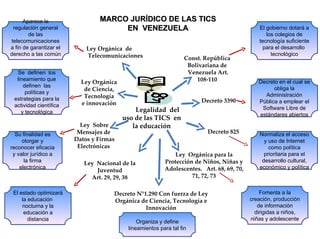 El documento presenta el marco jurídico de las Tecnologías de la Información y Comunicación (TIC) en la educación en Venezuela. Algunas de las leyes y decretos más relevantes incluyen la Constitución, la Ley Orgánica de Educación, la Ley Orgánica de Ciencia y Tecnología, el Decreto 825 y la Ley Orgánica para la Protección de Niños, Niñas y Adolescentes, los cuales promueven el uso de las TIC en la educación y definen las políticas y estrategias para el desar