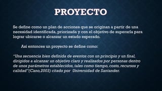 Un proyecto se define como una secuencia de eventos con un principio y un final, dirigida a alcanzar un objetivo específico dentro de restricciones de tiempo, costo y calidad. La gerencia de proyectos implica la administración de recursos y la dirección de acciones para culminar exitosamente el proyecto, siendo esencial un perfil profesional que incluya liderazgo, comunicación eficiente y capacidad de motivación. La ejecución del proyecto se organiza en fases, cada una con acciones y tiempos distintos, y el éxito depende de la evaluación continua y el compromiso del equipo.
