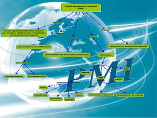 El documento presenta un mapa conceptual de PMI (Project Management Institute), que incluye los principales conceptos y procesos de gestión de proyectos según PMI.