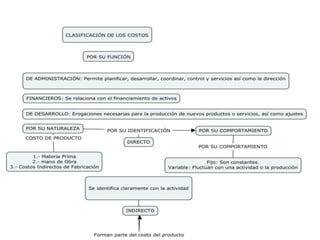 Los costos se clasifican en costos fijos, variables y mixtos. Los costos fijos son aquellos que no varían con el nivel de producción, como el alquiler de una planta. Los costos variables varían directamente con el nivel de producción, como los materiales. Los costos mixtos contienen componentes fijos y variables, como la mano de obra directa.