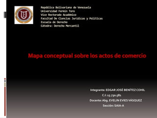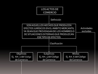 Este documento define los actos de comercio como aquellos hechos que producen efectos jurídicos en el ámbito mercantil ya sean provenientes de personas o situaciones externas. Explica que los actos de comercio se clasifican en objetivos, subjetivos y mixtos según su naturaleza y origen. También detalla algunas actividades que se excluyen de ser consideradas actos de comercio.