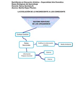 El documento describe la evolución del sistema nervioso y la cognición humana. Explica que la información externa e interna se codifica en redes neuronales y la corteza cerebral. Luego, detalla las etapas de la hominización, humanización y socialización, durante las cuales el cerebro se expandió y desarrolló nuevas habilidades como el lenguaje y las herramientas. Finalmente, resalta que los seres humanos actuales tienen la capacidad de reflexión representada en dibujos y estatuas.
