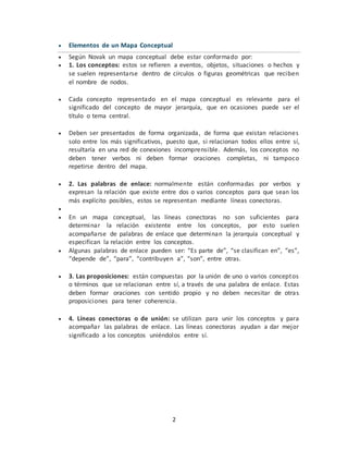 Un mapa conceptual es una herramienta gráfica para organizar y comprender ideas de manera significativa. Consiste en conceptos jerarquizados dentro de figuras geométricas y conectados por líneas y palabras de enlace. Fue desarrollado en la década de 1960 por Joseph Novak basado en teorías de aprendizaje significativo. Un mapa conceptual debe contener conceptos, palabras de enlace, proposiciones y líneas conectoras.