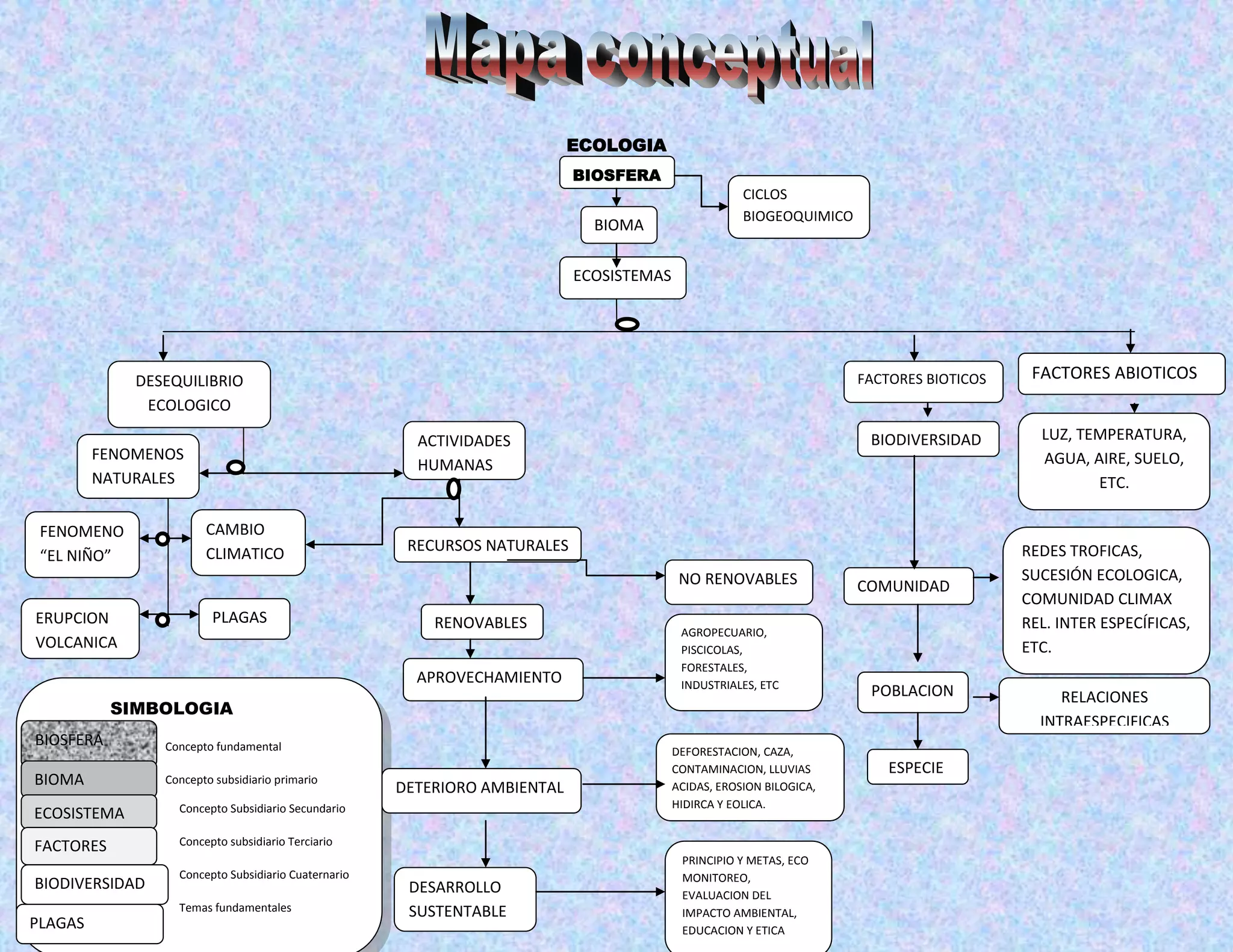El documento presenta conceptos clave de la ecología como la biosfera, biomas, ecosistemas, factores bióticos y abióticos. Explica cómo las actividades humanas como la deforestación, contaminación y cambio climático pueden causar desequilibrios ecológicos y deterioro ambiental. También menciona la importancia de un desarrollo sustentable que proteja los recursos naturales y la biodiversidad.
