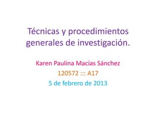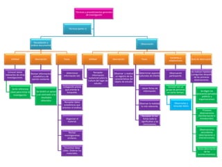 Este documento presenta diferentes técnicas y procedimientos generales de investigación como la recopilación y análisis documental, observación y entrevista. Describe la utilidad, descripción y pasos de cada técnica. La recopilación y análisis documental sirve para conocer datos relevantes de otras investigaciones y apoyar los resultados obtenidos. La observación permite recopilar información sustancial sobre la cultura del lugar de estudio. La entrevista recoge el discurso de las personas y orienta el diseño de la investigación.