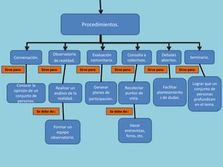 Este documento presenta varias técnicas y procedimientos generales para la investigación, incluyendo el análisis documental, observación, debate en grupo, entrevista, encuesta, grupo de discusión, historias de vida, conversación, observatorio de realidad, evaluación comunitaria, consulta a colectivos, debates abiertos y seminario. Cada técnica sirve para propósitos como recoger información relevante, definir hipótesis, conocer opiniones y testimonios. Los procedimientos incluyen formar equipos, definir objetivos e involuc
