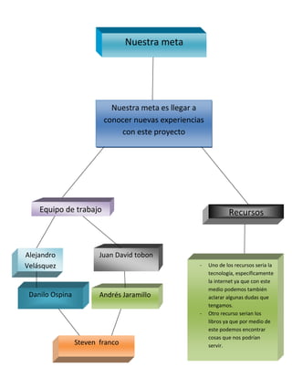 Este documento menciona recursos como la tecnología e internet para aclarar dudas, y libros para encontrar información útil. El equipo de trabajo busca conocer nuevas experiencias a través de este proyecto.
