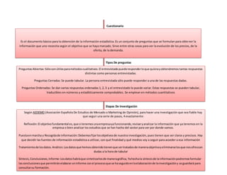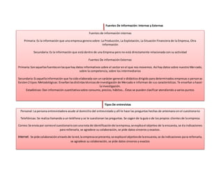 El documento describe las diferentes fuentes de información interna y externa que pueden utilizarse para realizar investigaciones de mercado. Explica que las fuentes internas incluyen información primaria y secundaria generada por la empresa, mientras que las fuentes externas incluyen datos primarios sobre el mercado y la competencia e información secundaria elaborada de forma general. También detalla los tipos de entrevistas, preguntas y etapas que deben seguirse para llevar a cabo una investigación fiable.
