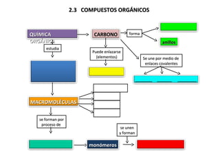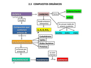 La química orgánica estudia compuestos que contienen enlaces de carbono. Estos compuestos pueden formar cadenas lineales o anillos y se unen mediante enlaces covalentes simples, dobles o triples. Las macromoléculas como carbohidratos, lípidos, ácidos nucleicos y proteínas se forman por la polimerización de monómeros.