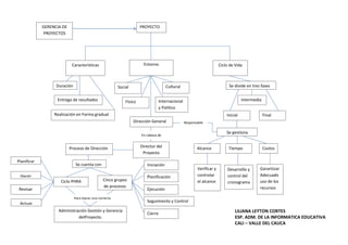 El documento describe los aspectos clave de la gestión de proyectos, incluyendo las fases inicial, intermedia y final; los cinco grupos de procesos de iniciación, planificación, ejecución, seguimiento y control, y cierre; y el ciclo PHRA de planificar, hacer, revisar y actuar. La gestión de proyectos se divide en tres fases y es responsabilidad de la gerencia de proyectos.