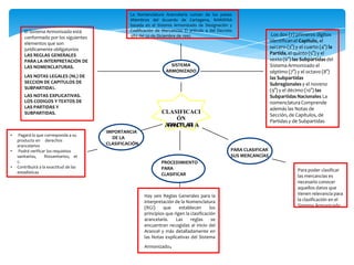 Este documento resume los conceptos clave de la clasificación arancelaria según el Sistema Armonizado. Explica que la clasificación de mercancías es necesaria para determinar los derechos arancelarios y cumplir con los requisitos sanitarios y estadísticos. Describe que el Sistema Armonizado se basa en seis dígitos para identificar el capítulo, partida y subpartidas de un producto. También cubre las seis reglas generales para la interpretación de la nomenclatura y los elementos jurídicamente obligatorios del sistema como las