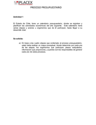 El documento describe las cuatro etapas del proceso presupuestario del Estado de Chile: formulación, revisión interna, aprobación/discusión y ejecución. En cada etapa se especifican los organismos involucrados, plazos establecidos e información requerida. Adicionalmente, se detallan las funciones de la Dipres, Tesorería General de la República, Contraloría General y Congreso Nacional en el proceso, así como los mecanismos de control interno y externo.