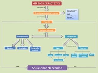 La gerencia de proyectos se encarga de organizar y administrar recursos como el tiempo, dinero, recursos humanos y materiales para ejecutar actividades y tomar decisiones que permitan el desarrollo gradual de un esfuerzo temporal con características como duración y resultados para solucionar una necesidad, considerando factores culturales, sociales, internacionales, políticos y físicos en las fases inicial, intermedia y final del proyecto.