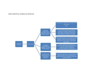 Este documento describe los componentes clave de la gestión de proyectos. Explica que los proyectos se componen de tres fases: inicial, intermedia y final, y que los ciclos de vida de los proyectos definen claramente el trabajo, los plazos de entrega y los responsables de cada fase. También identifica a los principales responsables de establecer el ciclo de vida de un proyecto, como el director del proyecto, el cliente, el equipo del proyecto y el patrocinador. Resalta que el rol principal del profesional es gestion