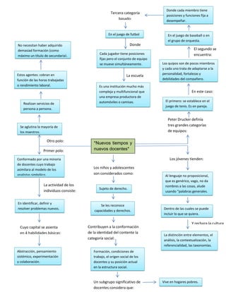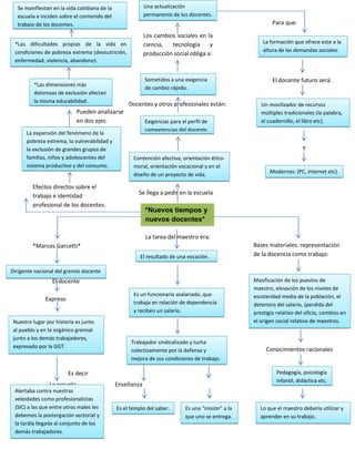 El documento discute el cambio en la percepción y el trabajo de los docentes. Antes eran vistos como una "misión" pero ahora son trabajadores sindicalizados que enfrentan desafíos como la masificación, la pérdida de prestigio y salarios más bajos. Los docentes deben actualizarse continuamente para satisfacer las demandas sociales cambiantes y enseñar a estudiantes con diversos orígenes y necesidades. El trabajo docente ahora requiere habilidades como el trabajo en equipo, la resolución de conflictos y comprender diferentes
