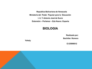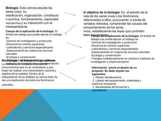 Este documento describe la biología como la ciencia que estudia los seres vivos, su clasificación, organización, composición química y funcionamiento. Explica que los biólogos trabajan en centros de investigación, docencia universitaria, laboratorios especializados, asesoría de recursos naturales, ecología y conservación. El objetivo de la biología es estudiar la vida de los seres vivos y comprender los mecanismos que controlan su comportamiento a través de métodos experimentales.
