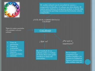 El documento habla sobre la calidad y la calidad total. Define la calidad como el resultado de un esfuerzo arduo para satisfacer las necesidades de los consumidores. Explica que la calidad es importante para ganar ventaja competitiva al brindar bienes y servicios de calidad a los clientes. También describe el camino hacia la calidad como un cambio cultural donde toda la organización participa asumiendo valores compartidos para crear un programa integral. Finalmente, define la calidad total como un sistema eficaz para integrar esfuerzos de desarrollo de calidad que se caracteriza por