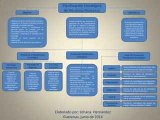 El documento describe la planificación estratégica de recursos humanos como un proceso crucial para optimizar el factor humano y enfrentar desafíos organizacionales. Detalla los objetivos, niveles y fases del proceso de planificación, destacando la importancia de anticiparse a futuras necesidades de personal y mejorar el clima laboral. Se menciona la necesidad de desarrollar planes de acción y un sistema de control eficaz para asegurar el éxito de la estrategia a largo plazo.