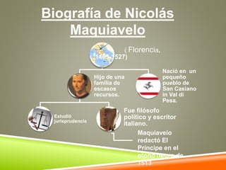 Nicolás Maquiavelo fue un filósofo político y escritor italiano del Renacimiento. Nació en 1469 en Florencia y escribió su obra más famosa "El Príncipe" en 1513. Maquiavelo consideraba que el mejor régimen es una república bien organizada y entendía que los gobernantes deben tener virtud y fortuna para alcanzar el poder, además de ganarse el favor del pueblo una vez en el poder dándole libertades. Analizó las formas de gobierno como la monarquía, aristocracia y democrac